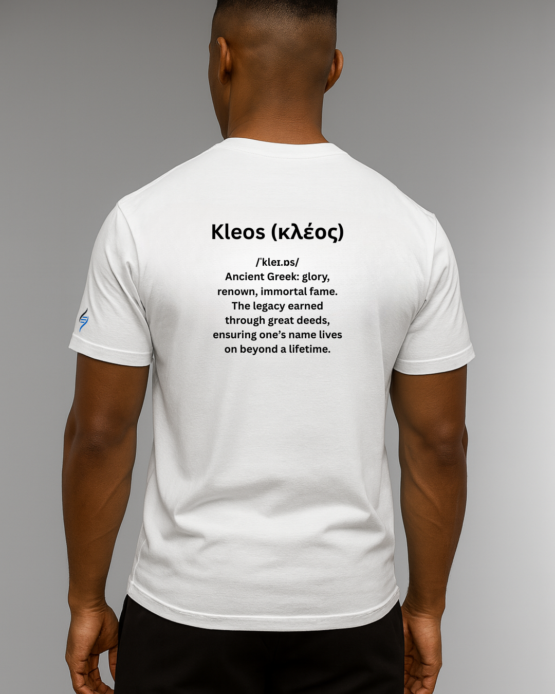 Left-chest KLEOS wordmark; dictionary-style back print explaining Kleos (κλέος)